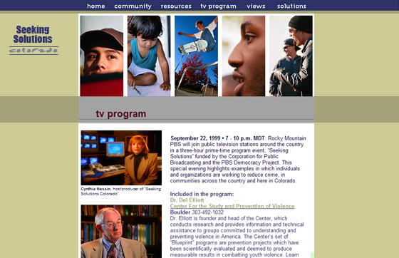 The TV program included government officials including U.S. Department of Education Secretary Richard Riley, and specialists like Dr. Deborah Prothrow-Stith, teen violence expert, Professor and Associate Dean at the Harvard School of Public Health. Meanwhile, the website provided a vehicle through which the community could speak up prior to, during and after the television broadcast. The Seeking Solutions website hosted a bulletin board, surveys and email forms, making it easy and convenient to respond. Viewer comments and poll results were posted on the website and used in the broadcast.